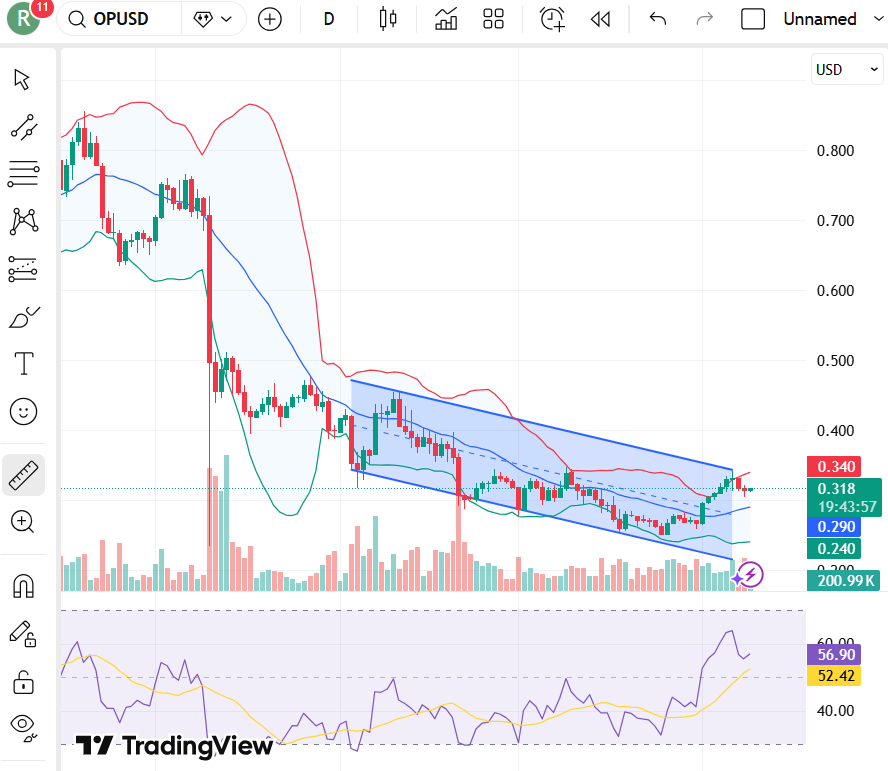 شهدت عملة OP ارتفاعاً ملحوظاً مؤخراً، لكنها تشهد الآن فترة استقرار بعد هذا الارتفاع. يتداول السعر حالياً عند حوالي 0.32 دولار أمريكي، مما يُشير إلى تماسك بعد الارتفاع الحاد. وهذا أمر طبيعي بعد ارتفاع سريع.