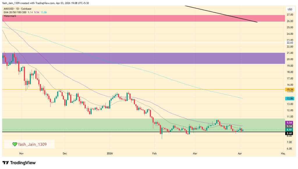 لا يزال سعر أفالانش (AVAX) محصورًا ضمن نطاق تذبذب طويل الأمد بين 8.60 و10.50 دولارًا أمريكيًا مع دخوله الربع الثاني من عام 2026.