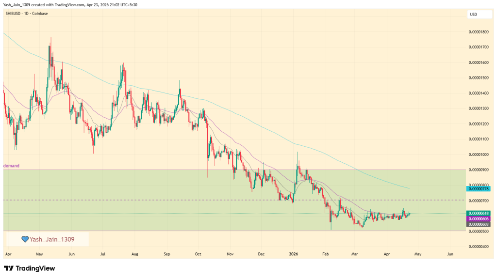 يُظهر الرسم البياني اليومي أن سعر SHIB يقع حاليًا ضمن نطاق تجميعي طويل الأجل، تشكّل على مدى عدة سنوات. ومن الجدير بالذكر أنه خلال الربع الأول، انخفض السعر إلى الحد الأدنى لهذا النطاق عند 0.00000500 دولار أمريكي.