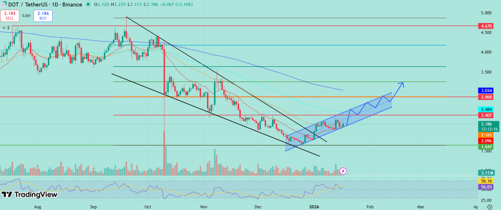 بعد انعكاس السعر، بدأت DOT بالارتفاع داخل قناة صاعدة، مُشكّلةً قممًا أعلى، ما رفع سعرها فوق مستوى دولارين. منذ ارتداد سعر DOT من منطقة الطلب عند 1.80 دولار، اتجهت المتوسطات المتحركة قصيرة الأجل صعودًا، كما أشارت مؤشرات الزخم إلى توقعات إيجابية.